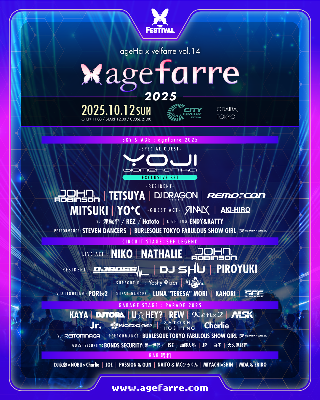 2006年に幕を閉じた伝説的スーパークラブ・velfarre(ヴェルファーレ)と、2022年に新木場での活動を終了した日本を代表するクラブブランド・ageHaがコラボする年に一度のモンスターパーティー"agefarre"(アゲファーレ)が、今年もお台場での野外フェスティバルとして開催!!